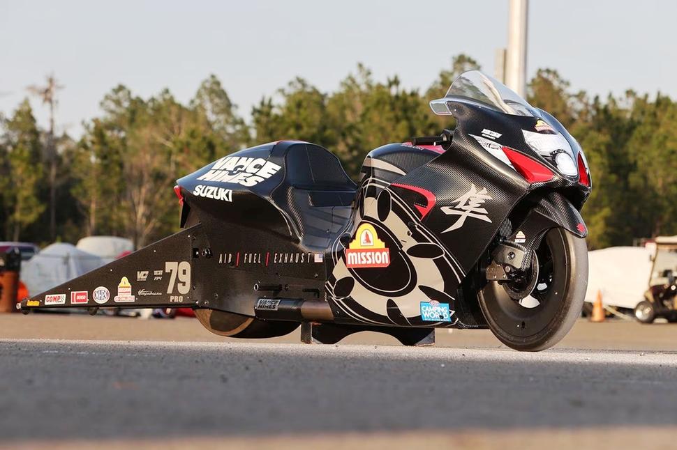 Эдди Кравец объяснил, как NHRA поддерживает визуальную связь между облицовкой дрэг-байка, который обязательно ниже и длиннее стокового, и капотировкой стандартного мотоцикла. Две очевидные особенности нового серийного мотоцикла - боковые жабры и спинка сиденья в виде головы кобры - сохранены в гоночной капотировке, как и увеличенный вынос обтекателя спереди, будто бы "съедающего" переднее колесо. А ветровик на дрэг-байке - вообще стоковый от Hayabusa!