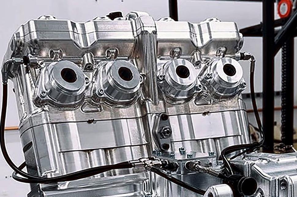 Блок двигателя, разумеется, фрезерованный из болванки (так называемый billet) - именно такие моторы издавна используются в дрэг-рейсинге. Новый двигатель очень высок, а вес его смещён вперёд намного дальше, чем это возможно для двухцилиндровых моторов. Это имеет большое значение в классе дрэг-рейсинга, в котором колёсная база ограничена 70 дюймами (178см).